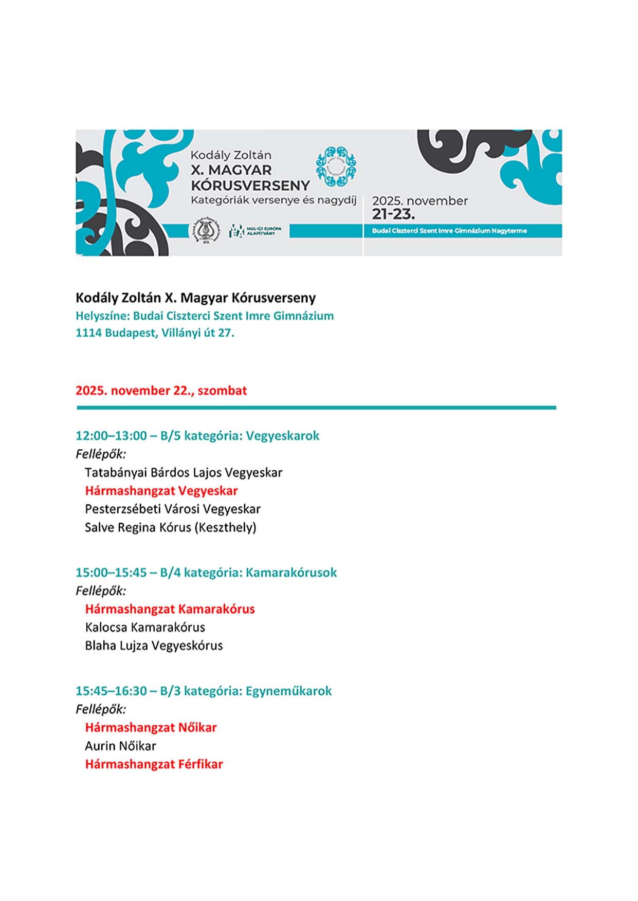 Az ELTE BTK Művészetközvetítő és Zenei Intézet énekkara, az Eszterházy Károly Katolikus Egyetem énekkara és a Prelude Vegyeskar „Hármashangzat” koprodukcióban nevezett a Kodály Zoltán X. Magyar Kórusverseny több kategóriájába. 2025. november 22-én, szombaton szeretettel várjuk kedves közönségünket! A részletek, valamint a verseny teljes programja a csatolmányokban olvashatók.